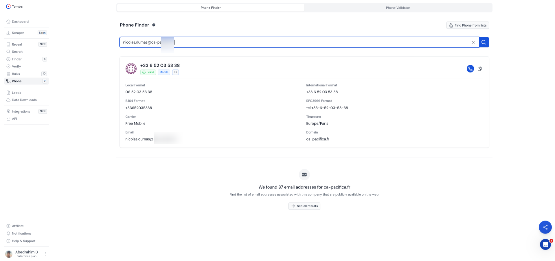 The email-to-phone lookup feature represents one of Tomba.io's most powerful capabilities. When you have a prospect's email address but need their phone number, Tomba.io searches its extensive database to find associated phone numbers.