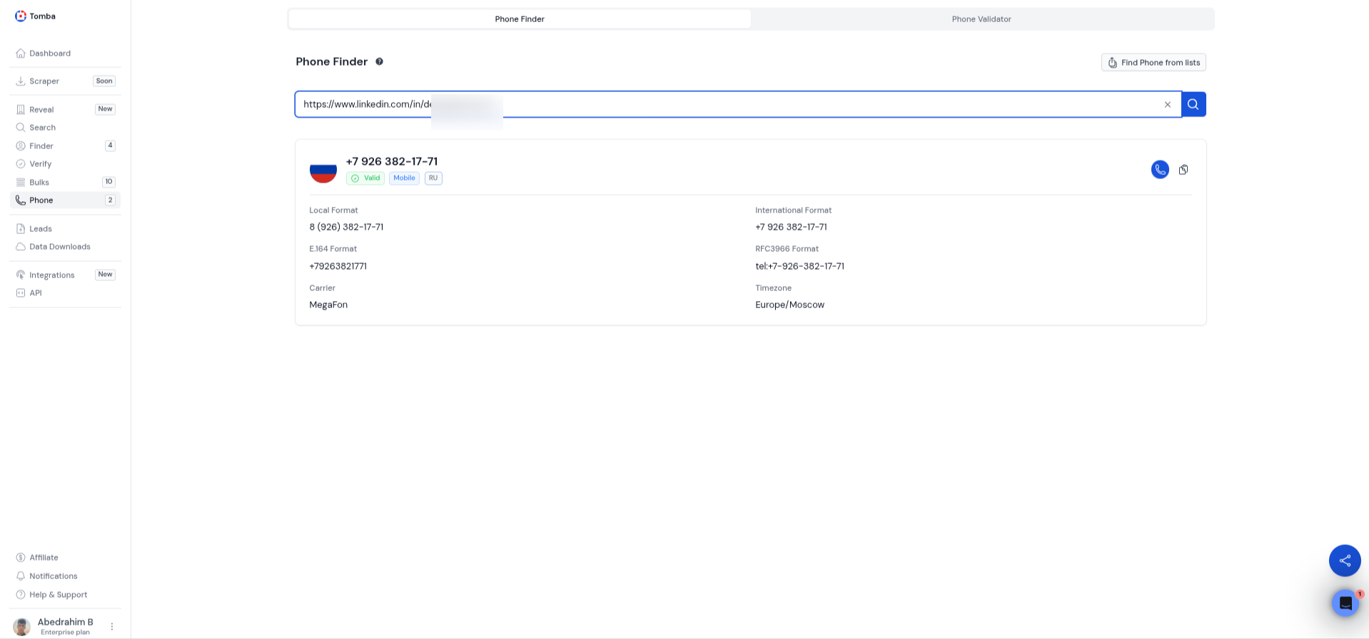 The LinkedIn lookup feature accepts profile URLs directly. Simply paste the LinkedIn URL into the search field and Tomba.io will extract and verify any associated phone numbers.