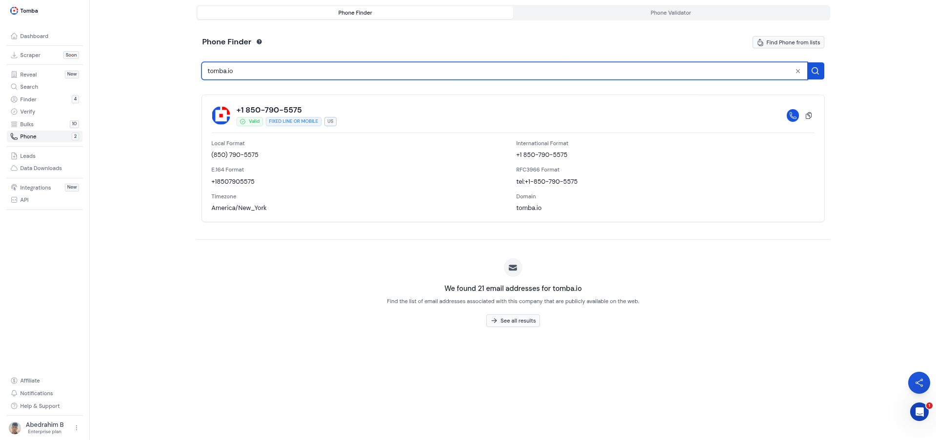 This feature works particularly well when combined with Tomba.io's industry-leading email finder. You can discover both email addresses and phone numbers for your target contacts through a single platform, streamlining your workflow and reducing tool sprawl.