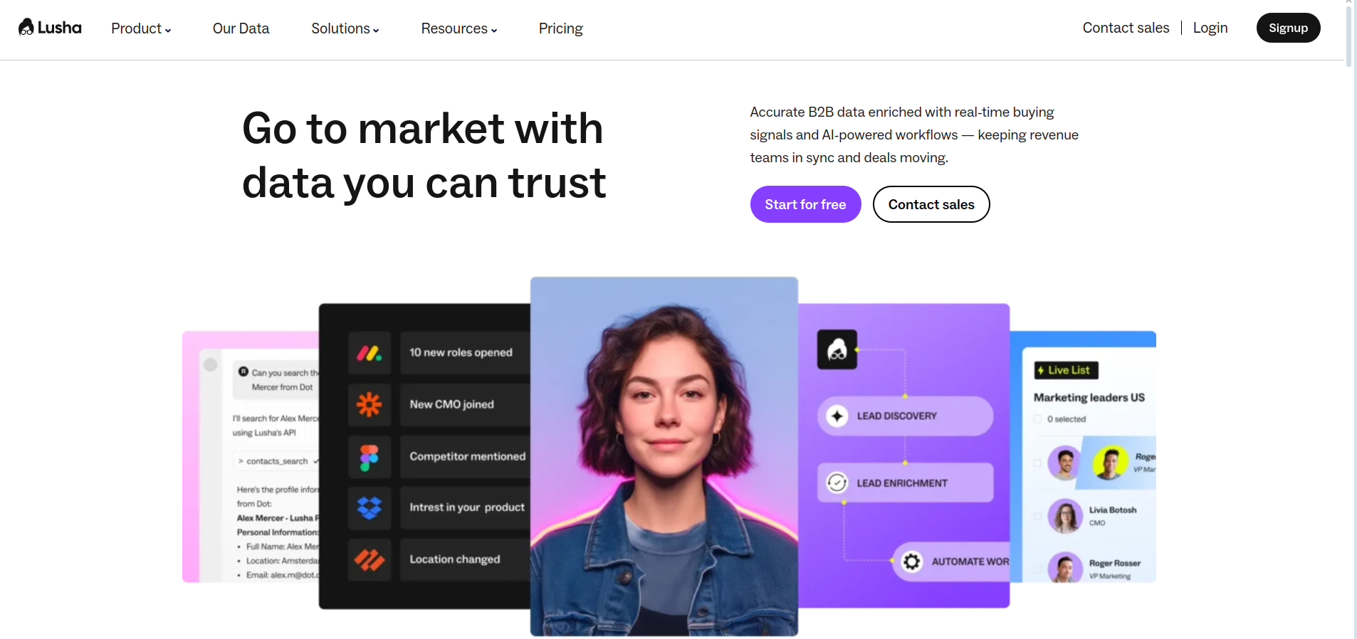 Lusha positions itself as a B2B contact data provider with strong LinkedIn integration. The platform offers a browser extension that reveals contact information when viewing LinkedIn profiles, including phone numbers and email addresses.