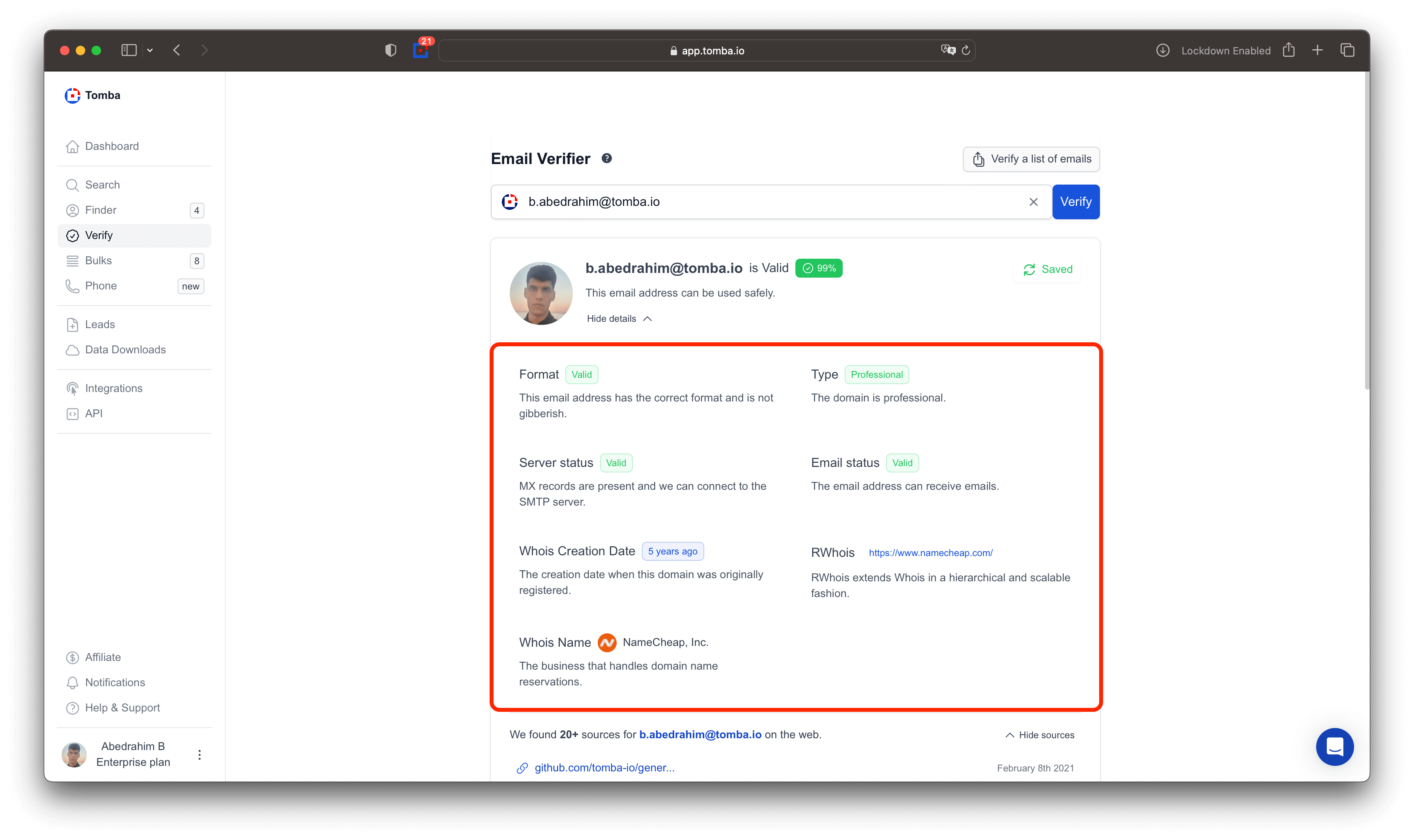 Upload your exported lists to Tomba.io. Run verification to identify which contacts are still valid and enrich them with additional data points.