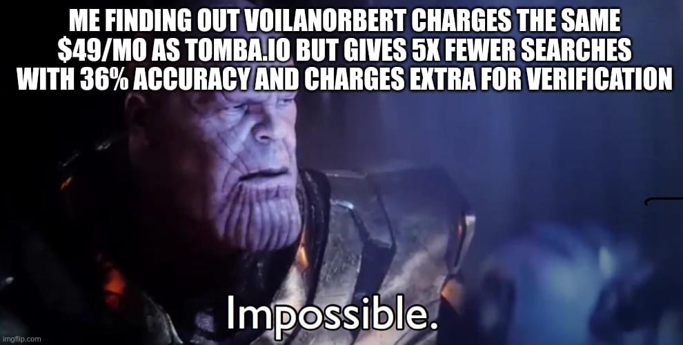 If you're paying $49/month for VoilaNorbert, you're getting 64% garbage data and 5X fewer searches than you could be getting with Tomba.io. Here's the proof.