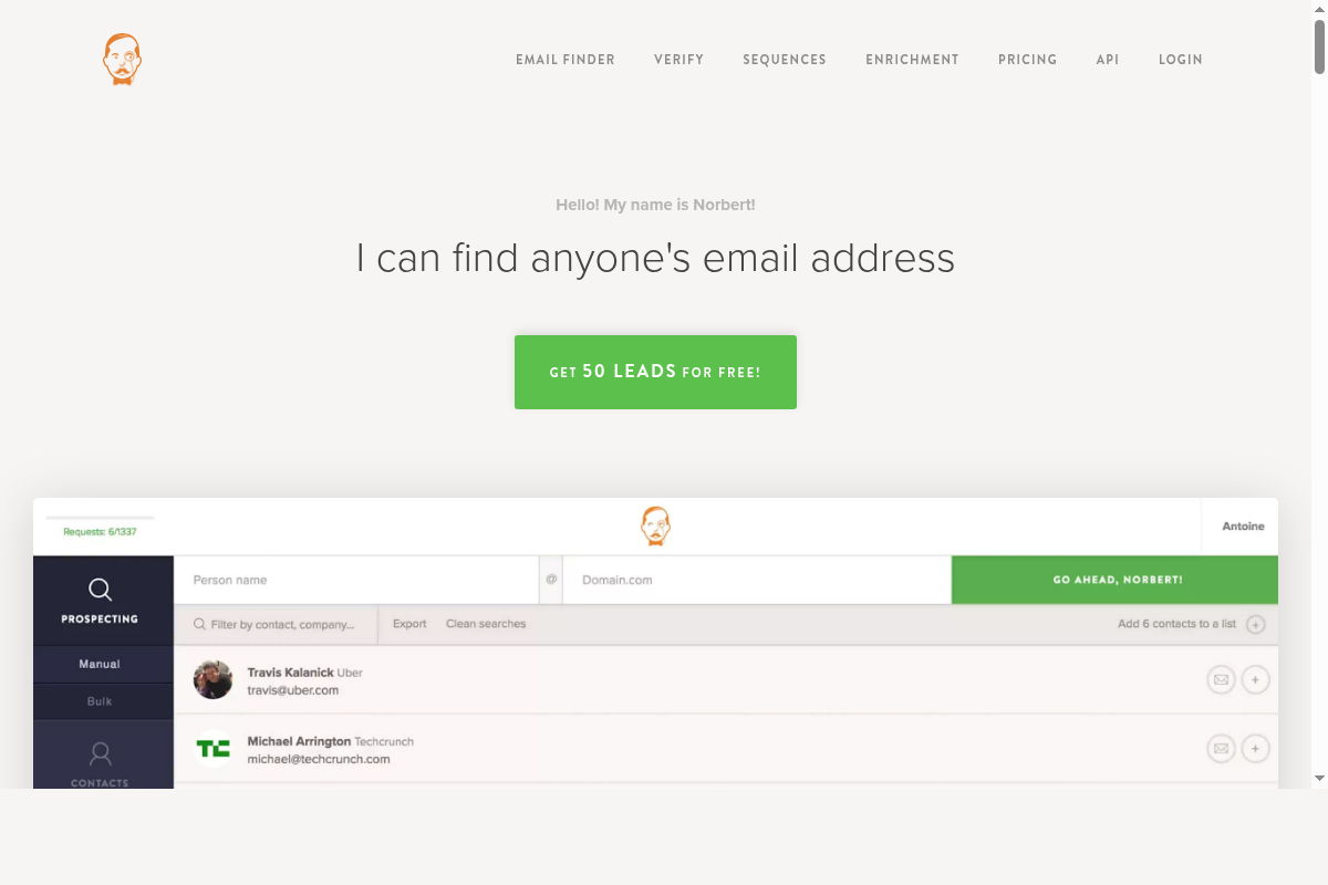 VoilaNorbert (also known as Norbert) is an email finding tool that has been in the market for several years. It positions itself as a simple, straightforward email finder with integrations for sales and marketing workflows. VoilaNorbert offers email finding, verification (at extra cost), and enrichment features.