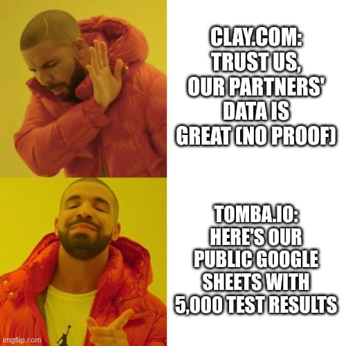 Because Clay doesn't control the data quality - their partners do. Since Clay aggregates from multiple providers with varying accuracy rates, publishing a single accuracy figure would be meaningless or embarrassing. Tomba.io publishes all accuracy data in public Google Sheets because we have nothing to hide.